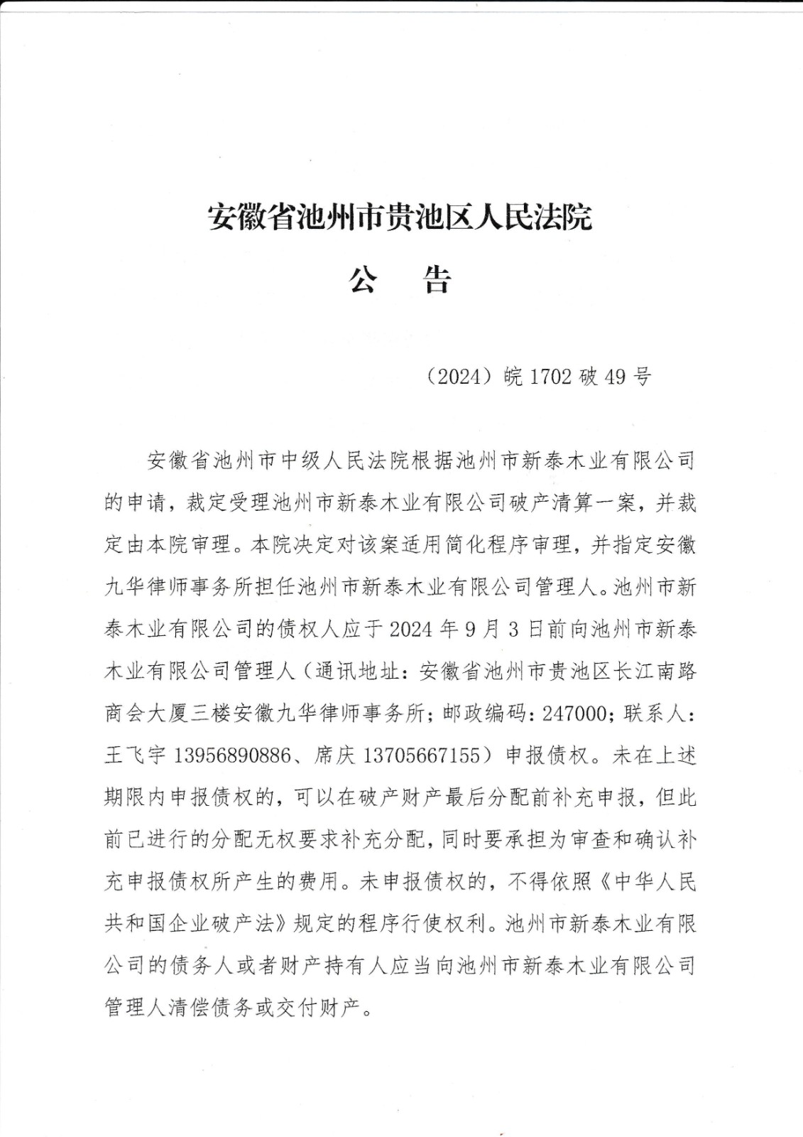 破49号一债会公告(新泰木业)